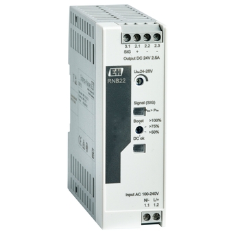 ENDRESS+HAUSER RNB22 is a compact, high-efficiency primary switch mode power supply for DIN rail interface systems. It delivers a reliable, single-phase, 24 VDC / 2.5 A output and runs on a wide-range input from 100 to 240 VAC / 110 to 250 VDC, with a dynamic and static boost of 5 A and 3.125 A respectively.